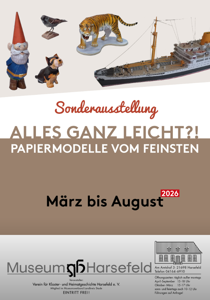 Wer hätte gedacht, dass ausgerechnet ein kleines Museum in Norddeutschland in diesem Frühling zu einem der spannendsten Ausstellungsorte für Kartonmodellbauer wird? Das Museum Harsefeld in der Gemeinde Harsefeld (Landkreis Stade, Niedersachsen) hat seit dem 13. März 2026 seine Türen für eine ganz besondere Sonderausstellung geöffnet: „Alles ganz leicht?! Papiermodelle vom Feinsten" – und sie läuft noch bis August 2026.
